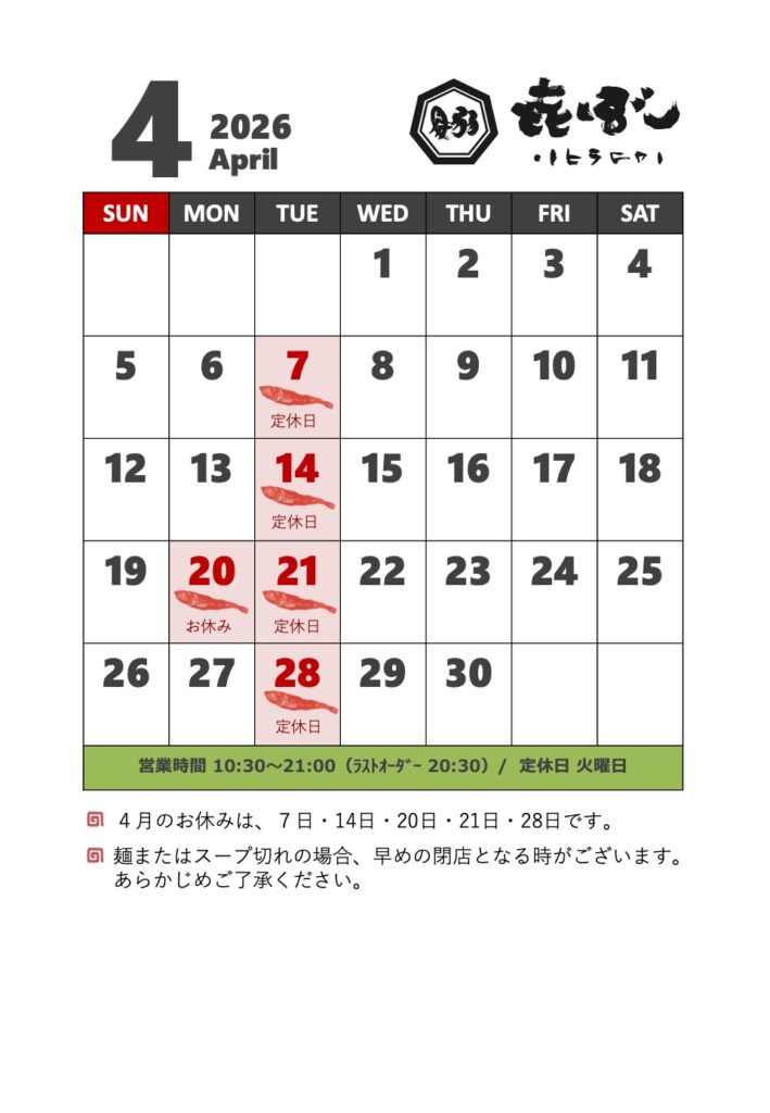 🍜 4月のお休み (定休日:火曜日)