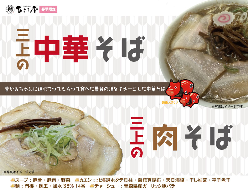 【ひらこ屋 春季限定】三上の中華そば・三上の肉そば 2026-03-18 最終更新日時 : 2026-03-18 hirakoya01 3/16から春季限定「三上の中華そば」「三上の肉そば」が始まりました! 昔かぁちゃんに連れて行ってもらって食べた屋台の味をイメージした中華そば。僕は幼い頃ラーメンが苦手だったので大分美化したイメージだがなんとなく喜多方風で作ってしまう。そろそろ4〜5年くらい経つが自分の中で毎日食える中華そばはこういうのだよなぁって思う。そんな僕の中華そば、ぜひ食べてください。 ひらこ屋(本店)での限定メニューです