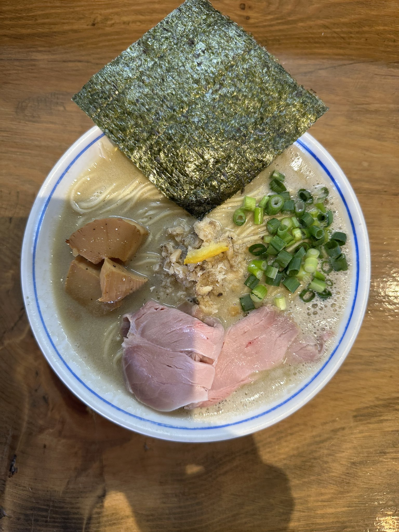 鯛の鮮魚×鯛焼き干しの100%鯛スープの濃厚な白鯛に仕上げました。アクセントに燻製メンマと燻製チャーシュー、味変に柚子辛味噌、麺は細ストレート20番、麺かたがオススメ。