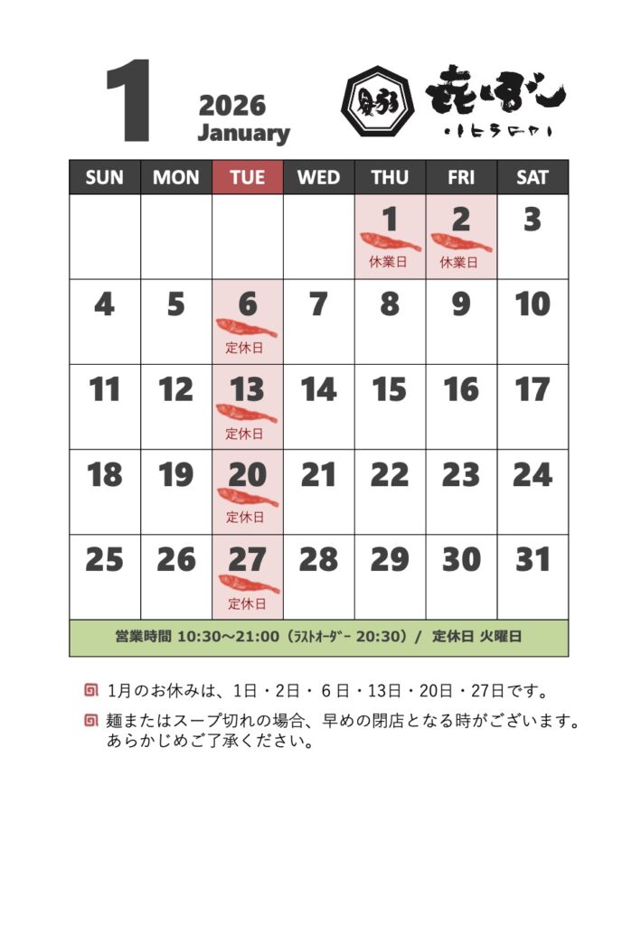 2026年1月の営業日【ひらこ屋 㐂ぼし】